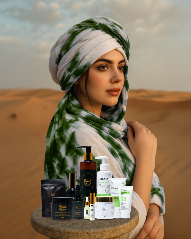 ETLALA est née au cœur du Sahara marocain, inspirée des rituels ancestraux de beauté sahraouie. Du soin du visage à celui des cheveux et du corps, nous mêlons traditions transmises de génération en génération et formules naturelles modernes, pour offrir une routine complète qui reflète la beauté de la femme marocaine… avec simplicité et sincérité.